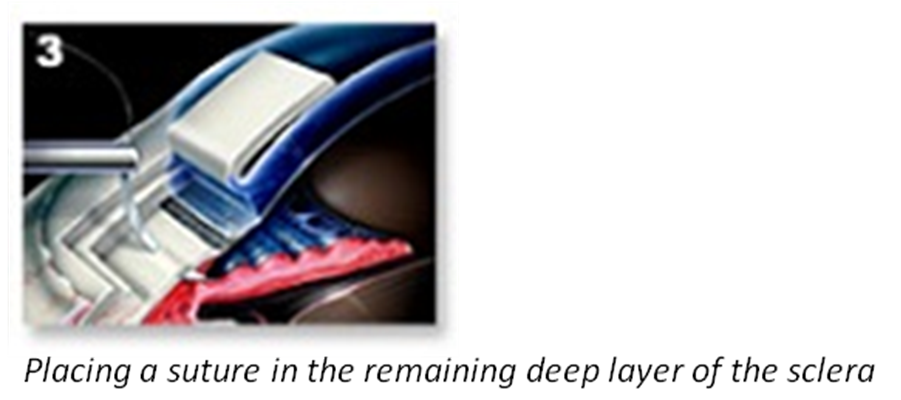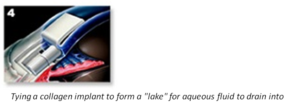 4. And finally the scleral and conjunctival flaps are sutured back down to form a drainage area known as a bleb.