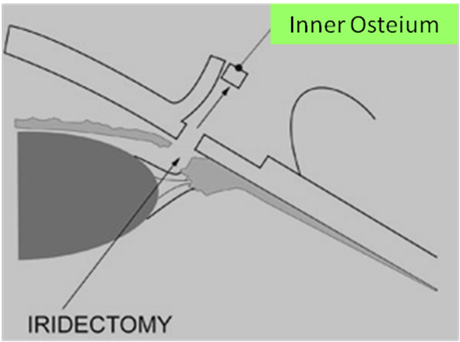A second flap into the sclera is cut which is only about halfway through the full thickness of the sclera. Then a scleral ostium is cut out of the remaining sclera, forming an aperture (sclerostomy) through the sclera into the anterior chamber to allow the outflow of aqueous.